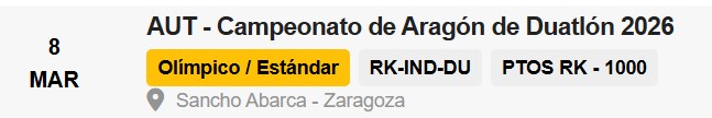 Sábado 31 de Enero 2026 Duatlón / Otros / 31 de Enero - Du Escolar y Du Sprint en Santa. Engracia / 8 de Marzo - Du Estándar No Draf. Sancho Abarca, Tauste - Zaragoza
