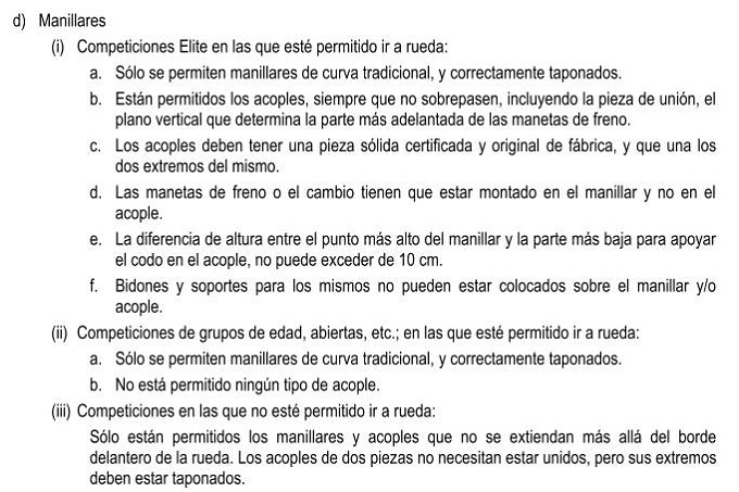 5. CICLISMO - 5.2. EQUIPAMIENTO - d) Manillares - (ii) Competiciones de grupos de edad, abiertas, etc.; en las que esté permitido ir a rueda: -b. No está permitido ningún tipo de acople.