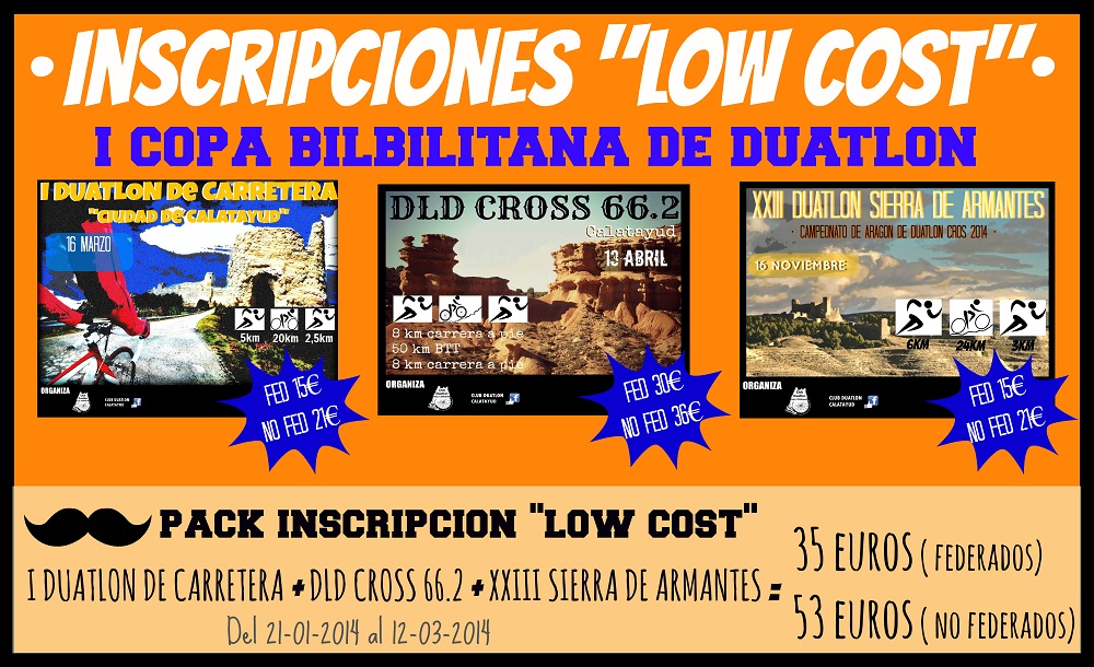 Ultimas horas para apuntarse al PACK LOW COAST CALATAYUD si te apuntas en el tendrás la inscripción de los tres duatlones realizados en CALATAYUD  por un precio realmente espectacular no llega a 12 € por duatlón incluido el de larga distancia. Este pack está limitado a 100 personas  y la fecha de finalización de la oferta es el miércoles 12 de marzo. En ellos se ofrecen los servicios que habitualmente se dan en las pruebas de Calatayud. Bolsa de corredor, duchas agua caliente, barra libre de liquido y solido después de la prueba y en las dos pruebas finales la popular judiada para reponernos de los esfuerzos. Si quieres probar con un duatlón de carretera distancia sprint aquí está tu oportunidad , sobre unos circuitos sin ningún tipo de dificultad puede ser tu primer duatlón. Circuito a pie  con un desnivel de apenas 5 metros y en el circuito de carretera apenas 20 metros de desnivel, la carretera permanecerá cerrada al trafico. Ahh y el tiempo que nos viene para esta ocasión es ideal para la practica deportiva. Con respecto a los demás duatlones daremos información conforme llegue la fecha.