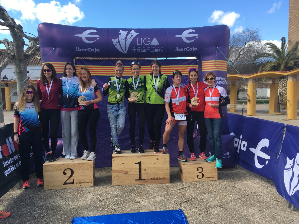 Triplete y dominio del equipo zaragoza Sport&Fun en la competición femenina, en la que tres de sus componentes han copado el podium final de la competición. Fátima Arévalo, que ha controlado la carrera desde el primer segmento, se ha adjudicado la medalla de oro del campeonato con un tiempo de 2:18:48, seguida de sus compañeras Gema Pascual y Teresa Higueras. Muy cerca de ellas ha llegado Irene Carreras (Triatlón Cierzo) que ha sido cuarta finalmente.