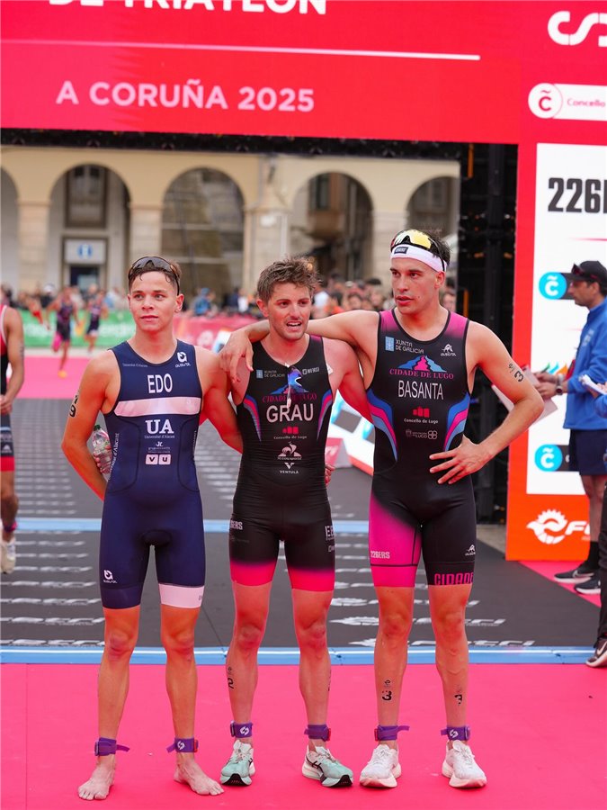 Ya en los 10 kilómetros finales de carrera a pie, se vivió una auténtica exhibición atlética. Genís Grau impuso un ritmo altísimo junto a Izán desde el primer kilómetro, Izán tiró y aguantó el ritmo, Genís aprovecho su estrategia para a escasos 500m sacar un punto más que Izán, lo que le sirvió para cruzar la meta en primera posición. Izan Edo, con una carrera muy sólida de principio a fin, entró en meta como segundo clasificado absoluto y primer sub-23, con un tiempo de 1:38:20 logrando un doblete de enorme valor y dejando claro que es uno de los grandes talentos del triatlón español.