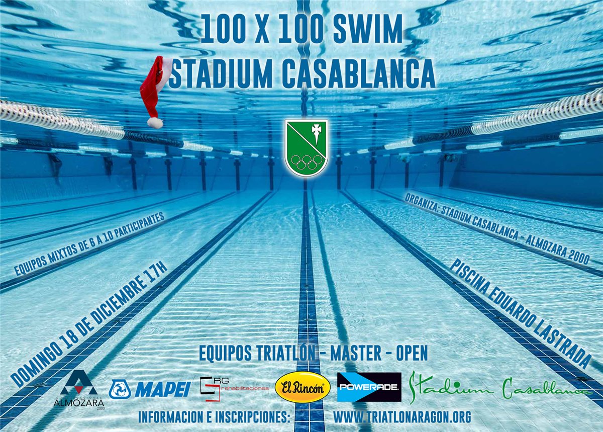 La prueba 100x100 SWIM MASTER/TRI/OPEN es una competición de natación por equipos entre 6 y 10 personas. Hay que completar una distancia de 10.000 metros en relevos de 100 m. Se celebrará el domingo 18 de diciembre de 2016. Todos los equipos deberán ser mixtos, de entre 6 y 10 participantes, estando formado por al menos dos personas de cada sexo. La edad mínima para participar será de 15 años cumplidos en 2016, no habiendo edad máxima. 20 PLAZAS DE EQUIPOS DISPONIBLES.