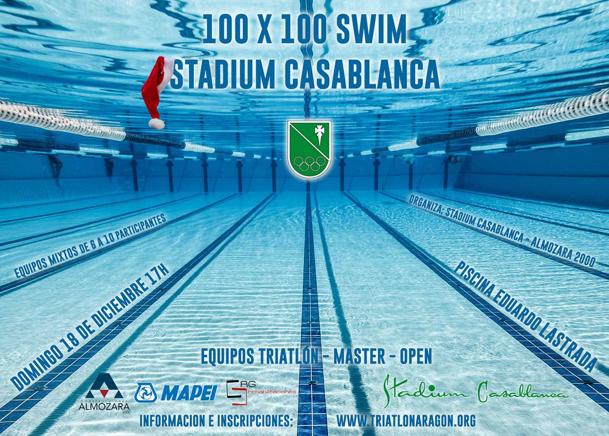 Stadium Casablanca - Almozara 2000 organiza el próximo 18 de diciembre de 2016 a las 17h. la segunda edición del 100x100 Swim Stadium Casablanca. La competición se celebrará en la piscina Eduardo Lastrada donde 20 equipos deberán complatar 10.000m de natación en relevos de 100m. en el menor tiempo posible.